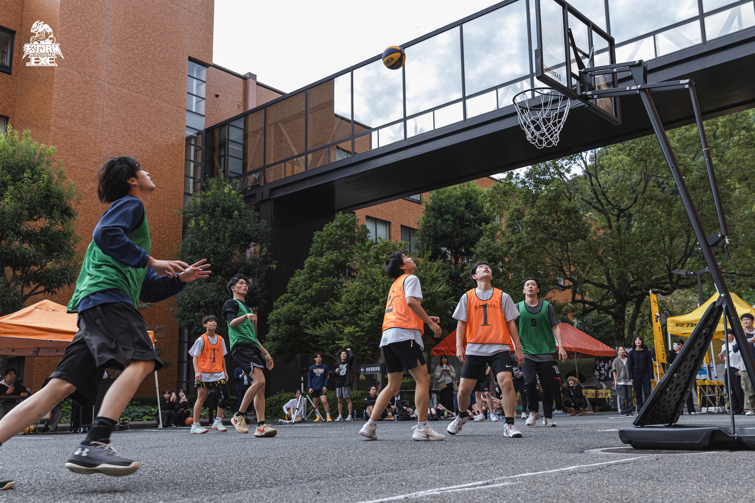 当日は、キャンパスの真ん中に特設されたコートで3x3を実施。学生や来場者が立ち止まって観戦する中、熱気あふれるプレーが繰り広げられました。
